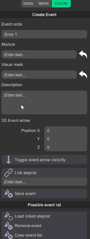 From here you can load the step lists linked to an event. You can also view exististing events, modify them, remove them, or clear the entire list.